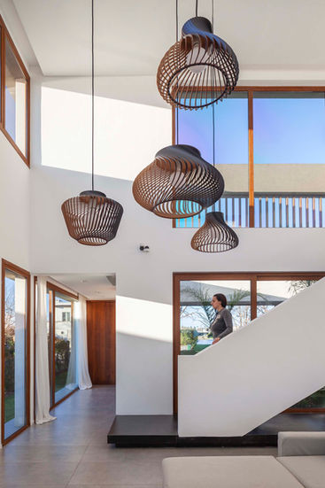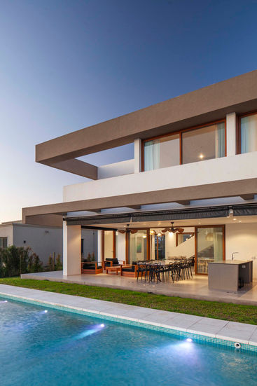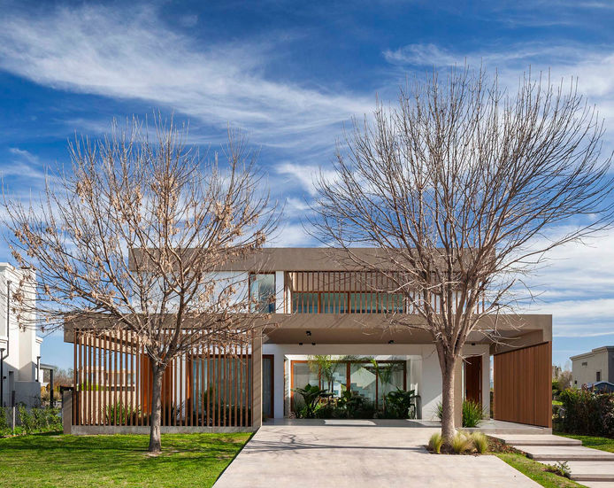 Casa en 2 plantas, con espacios en doble altura. Combina colores claros y parasoles para lograr una casa neutra y moderna a la vez.